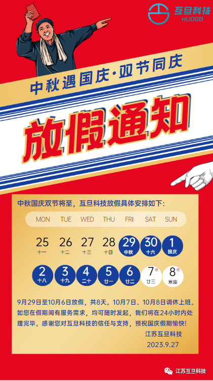 互旦科技將執行9月29號-10月6號國慶休假,10月7-8號調休上班。不過即使放假,互旦科技也會安排好假期工作,各對接群和負責人不變,責任終身,明確擔當,能扛事不推脫,假期內您如果有任何需求,我們都會在24小時內處理完畢!