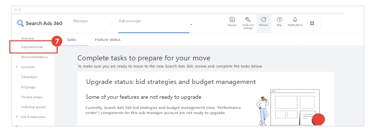 ⑦ 在查看子級經(jīng)理賬號時(shí),可以通過頁面菜單來訪問體驗(yàn)中心 。通過體驗(yàn)中心可以及時(shí)了解即將推出的功能,以及所有最新的增強(qiáng)功能。